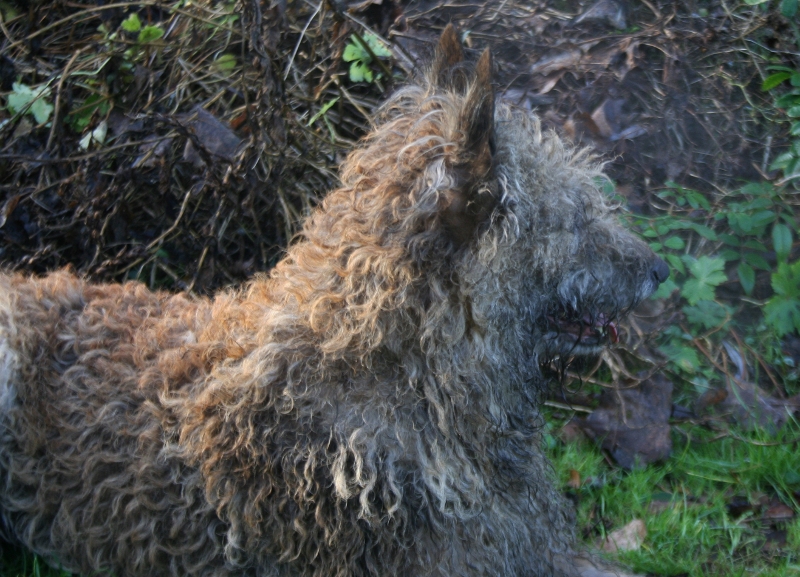 Bij vragen naar het nest en de combinatie van honden word ik meteen met mijn neus op de feiten gedrukt. De prachtige foto’s op de website laten de belijning van Sterre goed zien maar ze lijkt, net uit de vacht, meer op een Mechelaartje dan een Laekense. Dus, dit is ook Sterre, op een koude januari ochtend, dampend van het spelen met de Border Collies en de vacht, in de nek en hals, al half geplukt door haar Border Collie vriendjes.