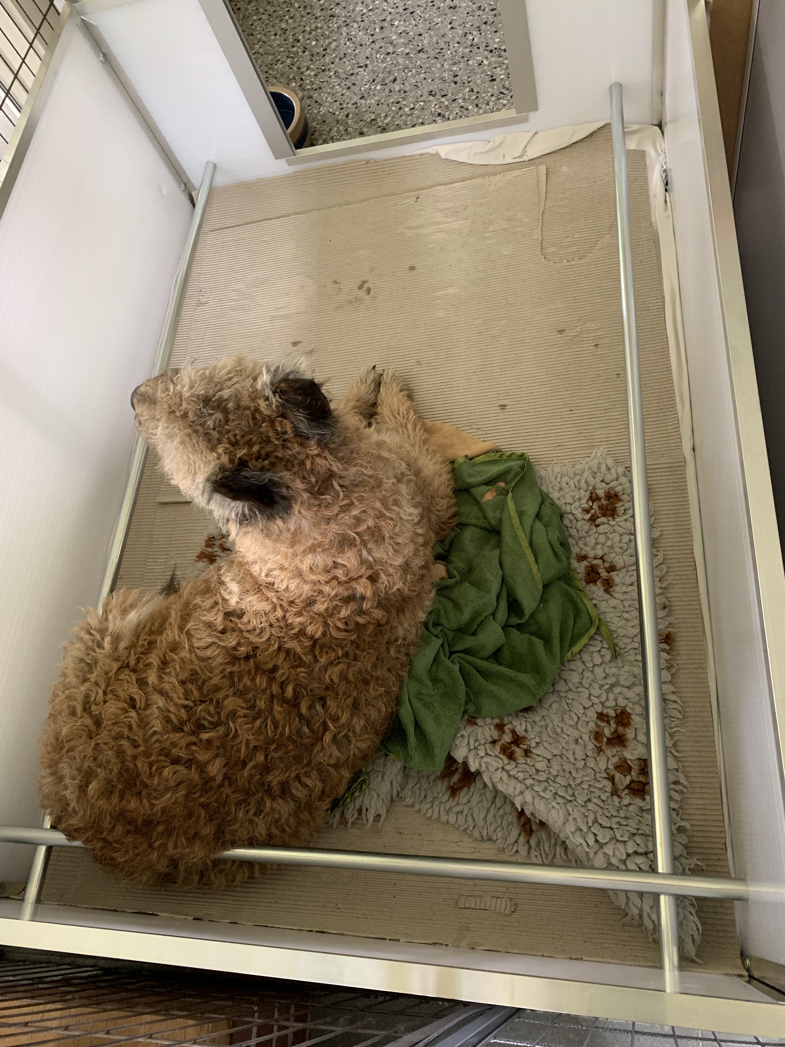 Ik tel de dagen nog eens na, op zaterdag eerste dekking, maandag weer. Woensdag is ze onrustig en hijgerig. Ik meld de dierenarts, zoals afgesproken, dat ze is begonnen met de voorbereidingsfase. Haar temperatuur is weer gestegen en ze verbouwt haar mand continue.