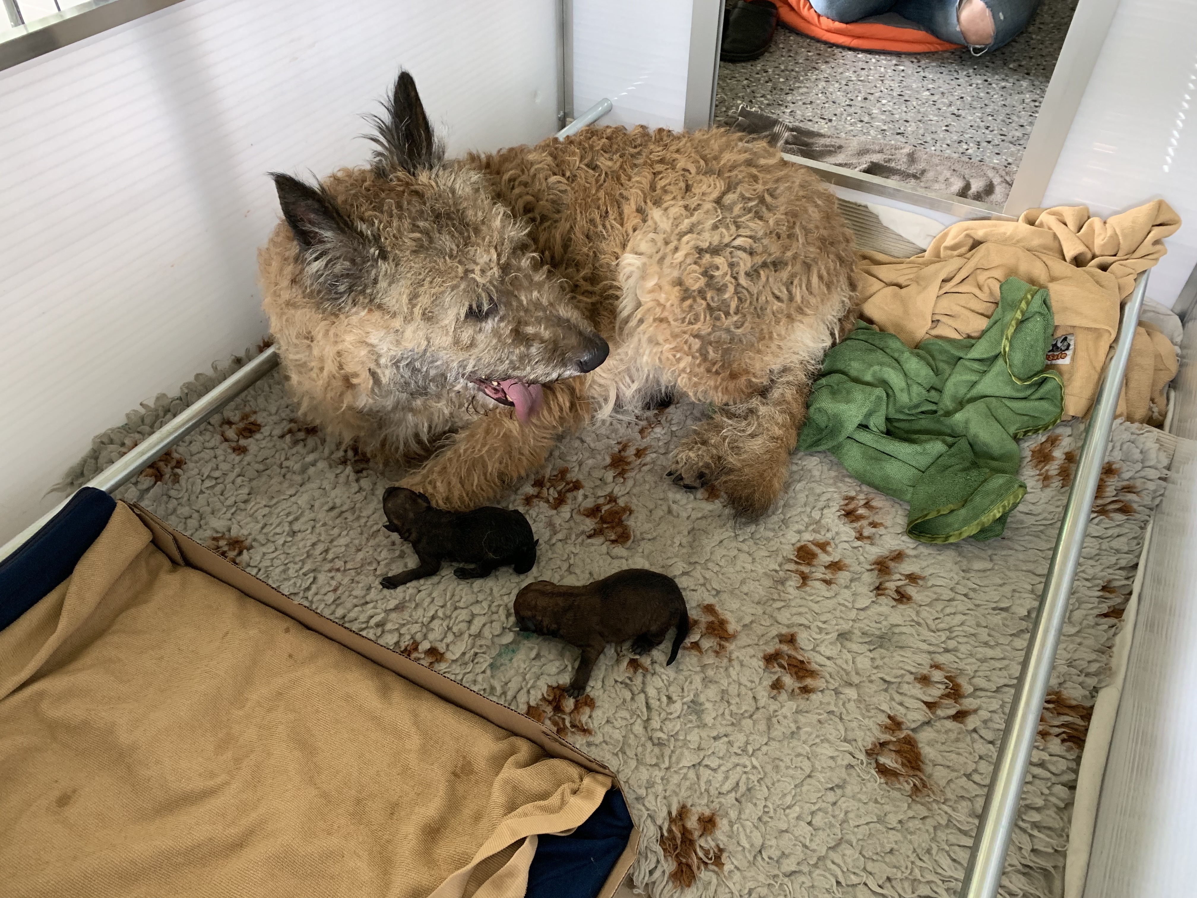 En dan twee krachtige weeën en ineens is daar de eerste pup, zowel zij als ik zijn verbaasd en ik help haar de pup droog te wrijven. Ze likt, snuffelt en controleert de navelstreng. Verder weet ze nog niet zo goed wat ze met dat heftig protesterende ding aan moet. Het is een flinkerd en het is een teefje. Ik app coach Edwin en die zegt, “komt goed, ik kom eraan”.