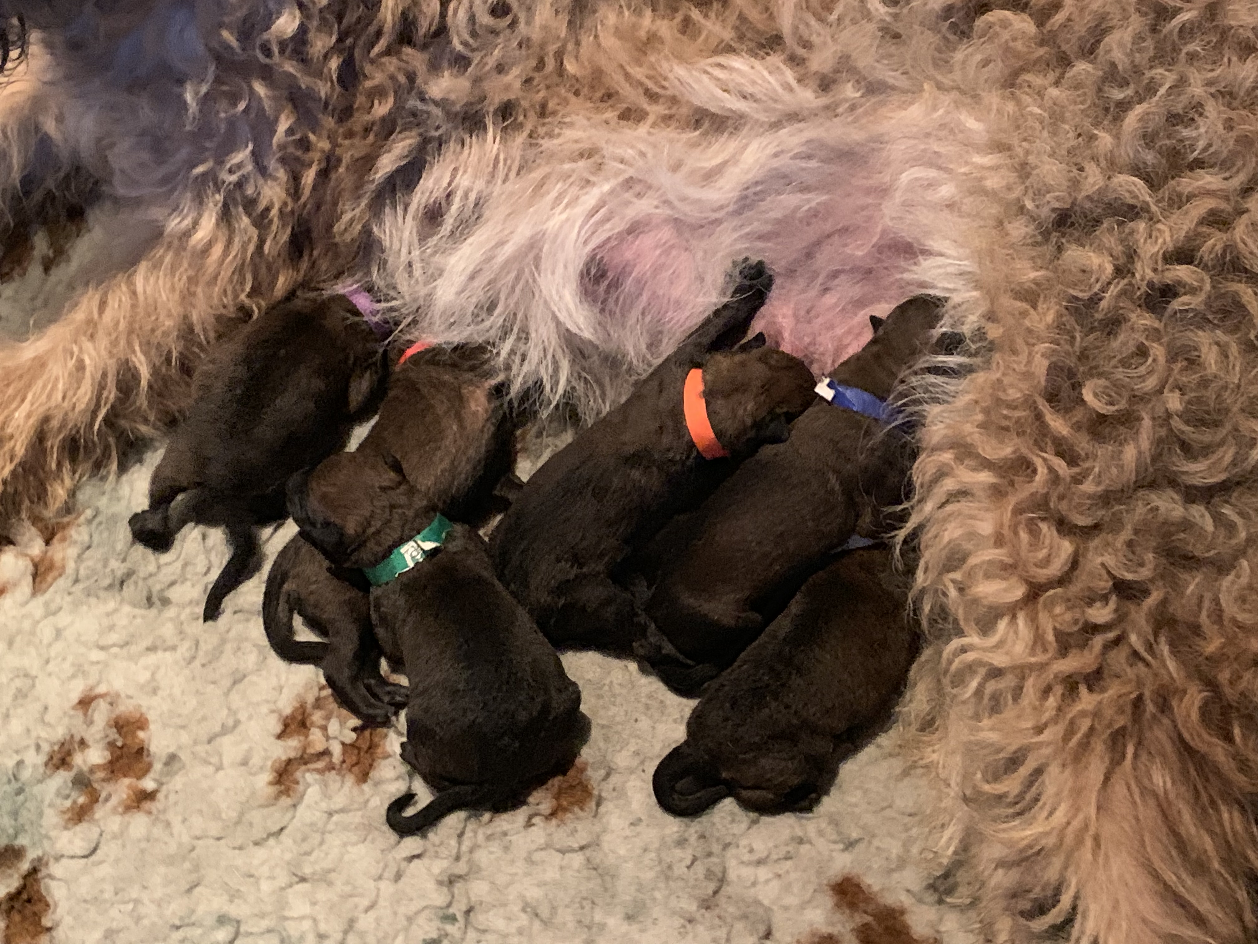 Voor we goed en wel gewend zijn aan het idee dat er één is geboren, ligt nummer twee in de werpkist. Ik had net een schone handdoek vast en dat was geen moment te vroeg. Nu neemt de natuur het over. Ze wast en likt, ik controleer of het vlies goed weg is rond het hoofdje en zie dat het een reutje is, met stevige longen. Nu gaat het snel en wanneer Edwin binnen wandelt, dient nummer drie zich al aan. In krap zeven uur worden er acht puppies geboren, vijf reuen en drie teefjes. En dan is het middernacht. Alles drinkt, slaapt en drinkt weer. Van voor- tot achterpoten, en ook onder haar poten, overal puppies.