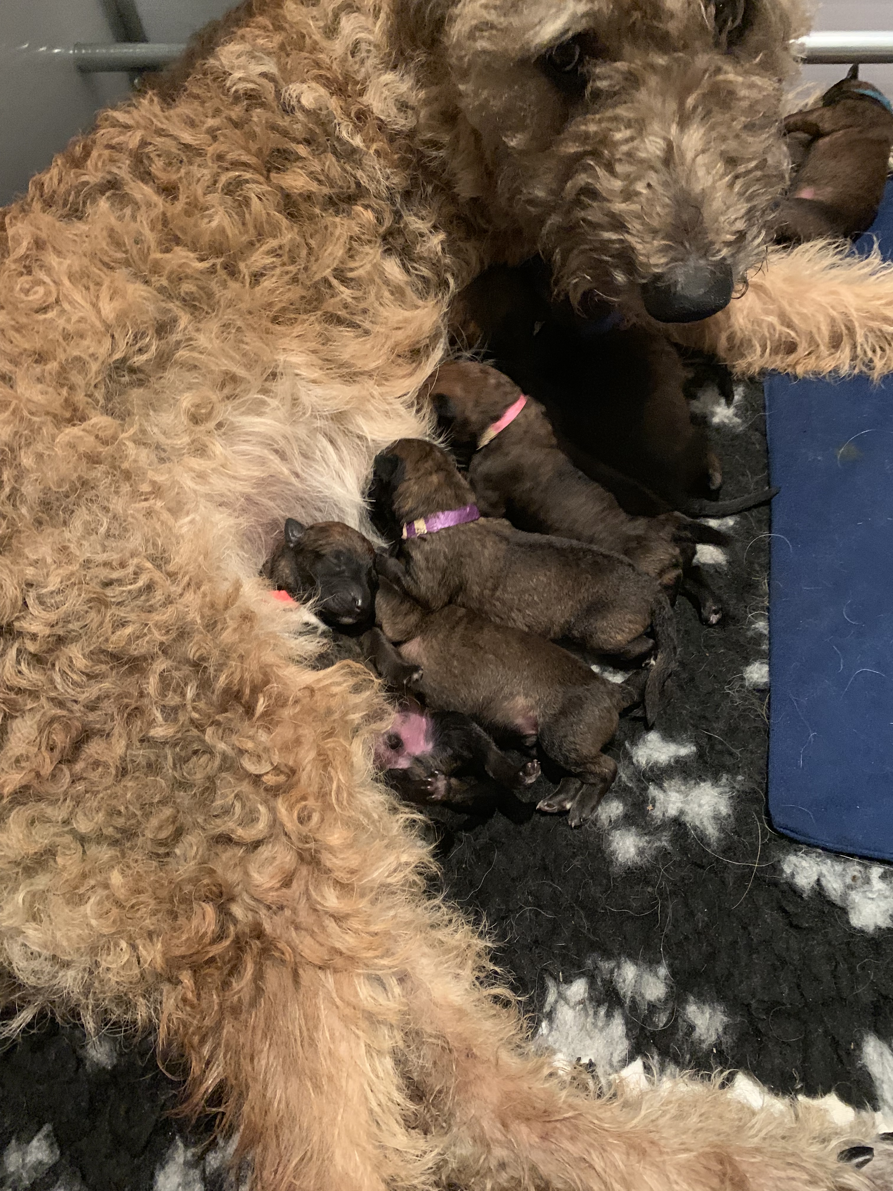 Ze legt heel rustig en geduldig uit hoe het werkt en we halen de eerste melk op bij Sterre. Die laat het allemaal gebeuren en blijft de rest van haar kroost voeden, er liggen her en der al pups met een dik buikje, op hun rug te slapen.