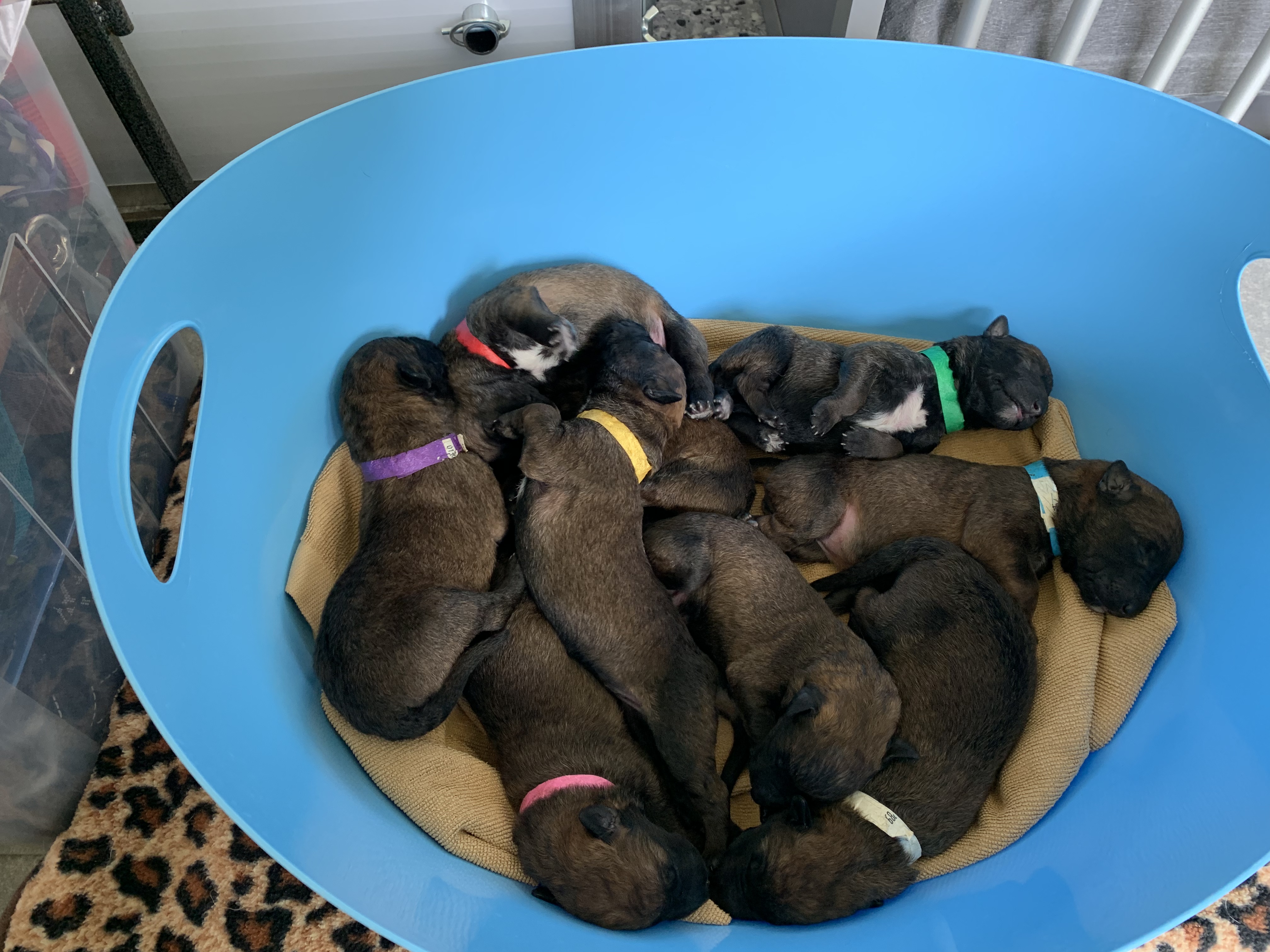 De tafel is een explosie van spullen voor de bevalling en de eerste uren. Terwijl de pups met tevreden geluidjes in slaap vallen, sorteer ik de materialen.