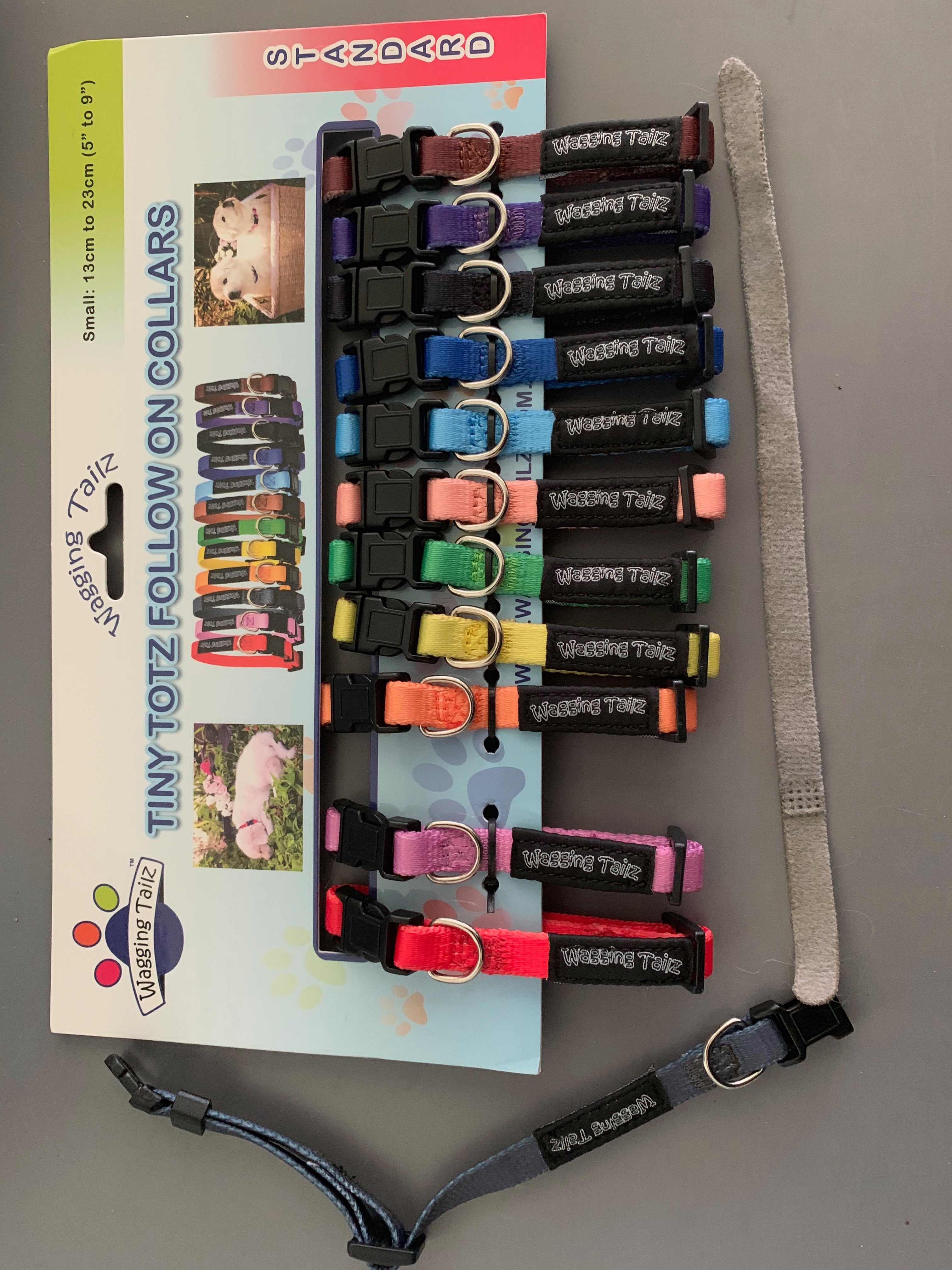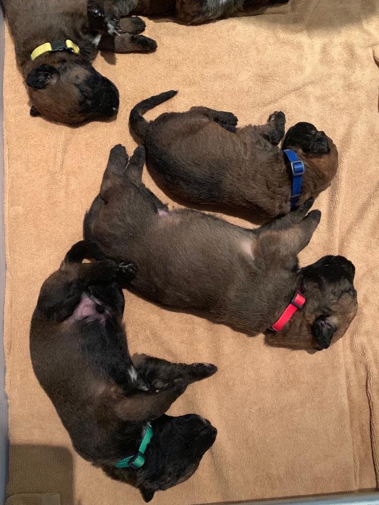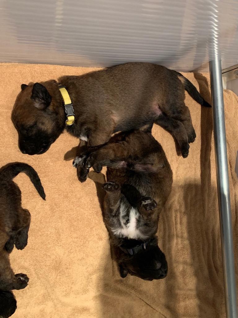 Nieuwe bandjes om. Grijs gooit zijn bandje met klittenband steeds af. Echte halsbandjes krijgen ze nu. Die had ik al gekocht voor de echo was gemaakt.
