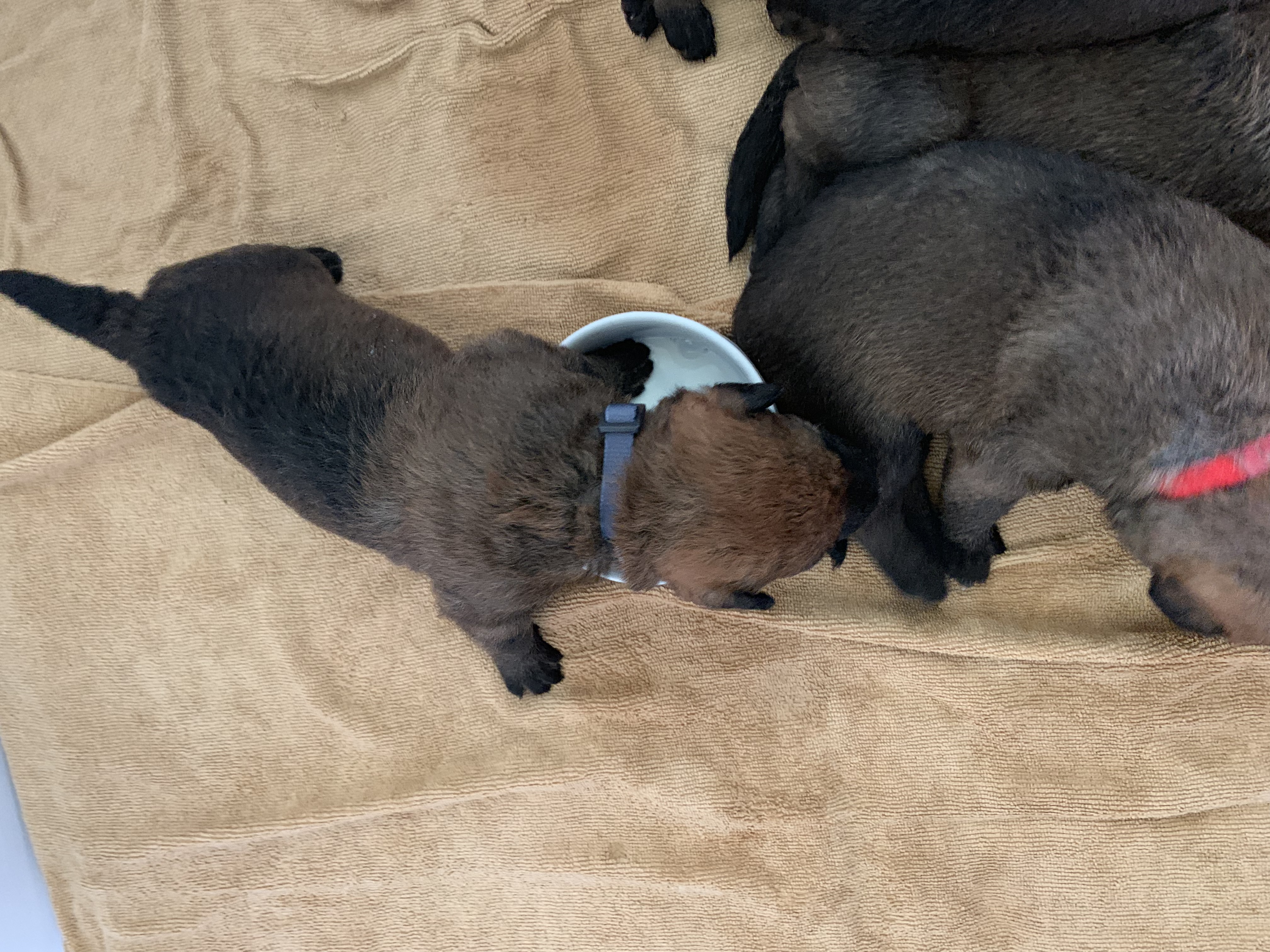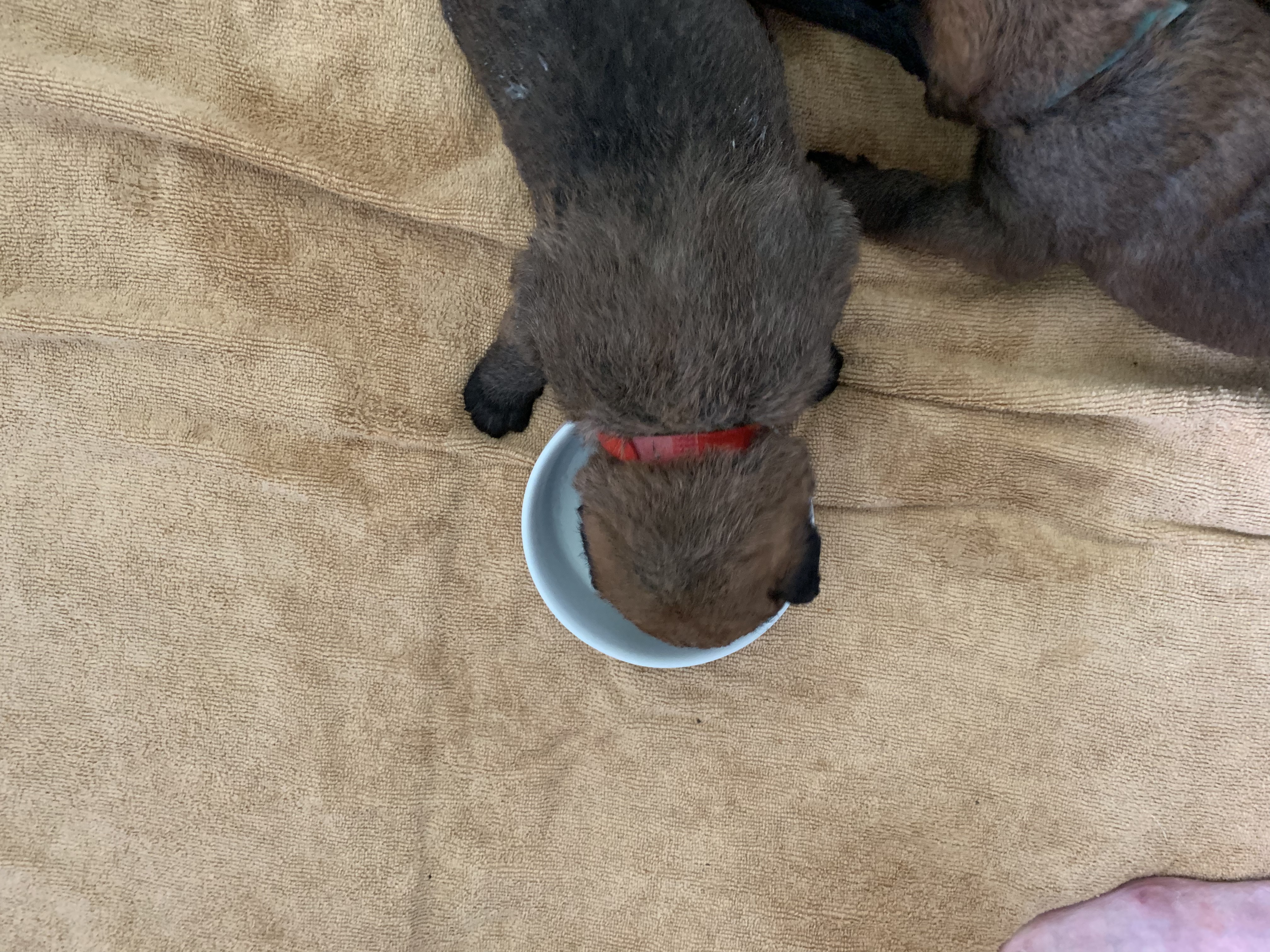 Ze hebben net de eerste melk zelf uit een bakje gedronken. Was een heel festijn! De één viel er opaan alsof ie er jaren op had gewacht. Geel ging in de achteruit. Grijs lag er uiteindelijk languit in!