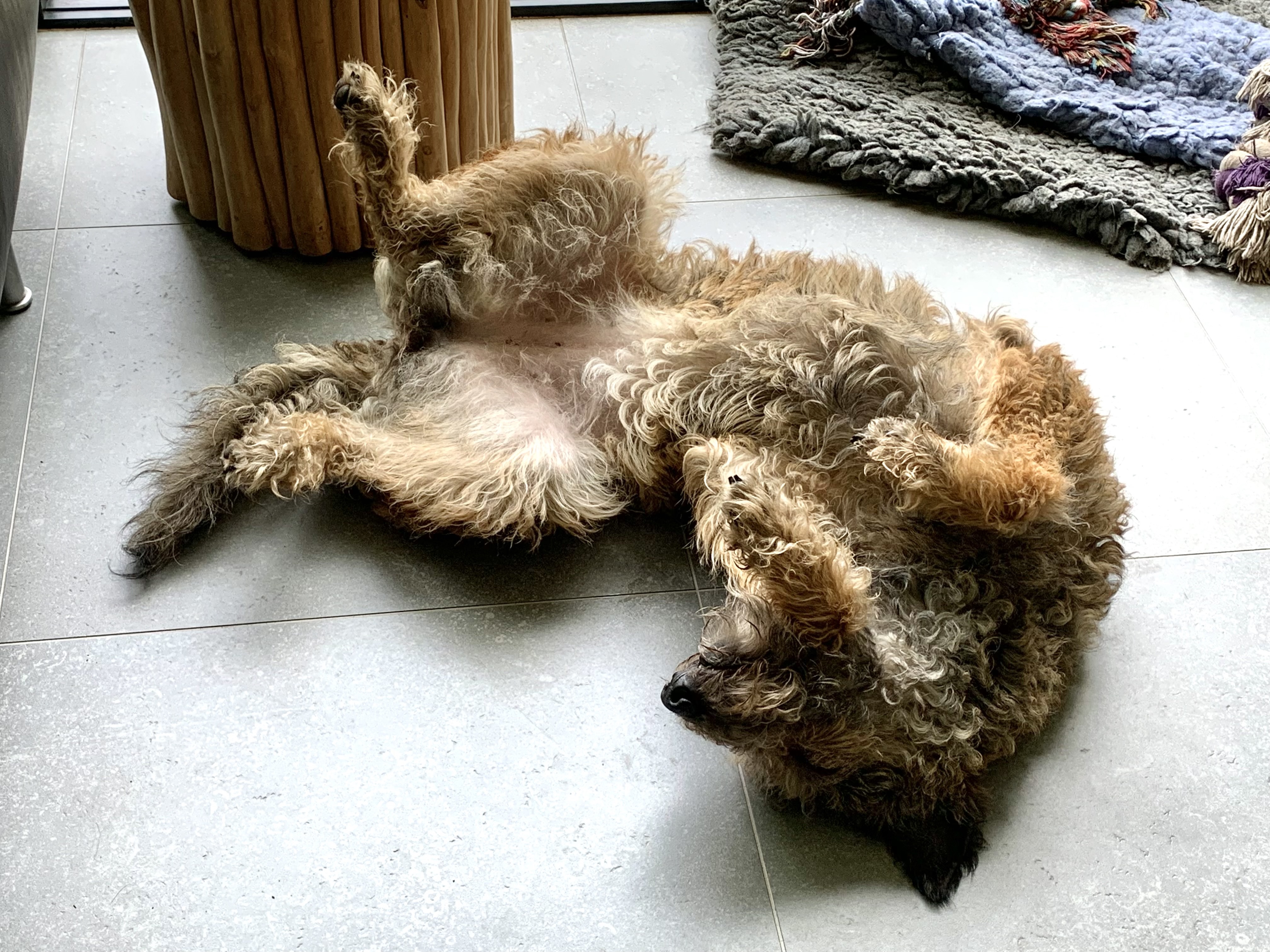 Aagje hanteert een compleet andere methode. Die rolt eerst lekker op haar rug over de meurende vis en gaat er dan naast liggen, alsof hij ieder moment weer tot leven kan komen.