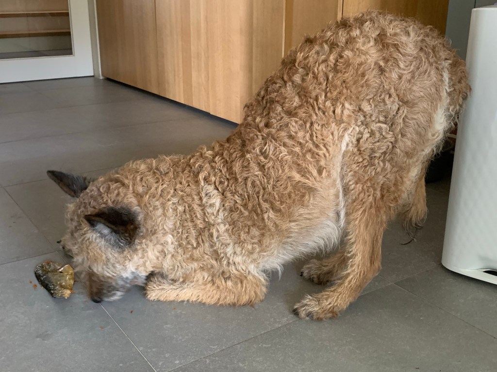 Ze is ook wat korzelig, wil niet meer door alles en iedereen aangehaald worden en komt moeizaam in de benen wanneer ik haar roep. Alleen voor wat lekkers is ze nog te porren. Dus krijgt ze gedroogde zalmfilet, dat vindt ze heerlijk. Lekker op haar buik met de poten er omheen lukt niet meer maar ze heeft een wonderlijke manier gevonden om dit probleem te omzeilen. Ze zakt door haar voorpoten en peuzelt het lekkers rustig op.