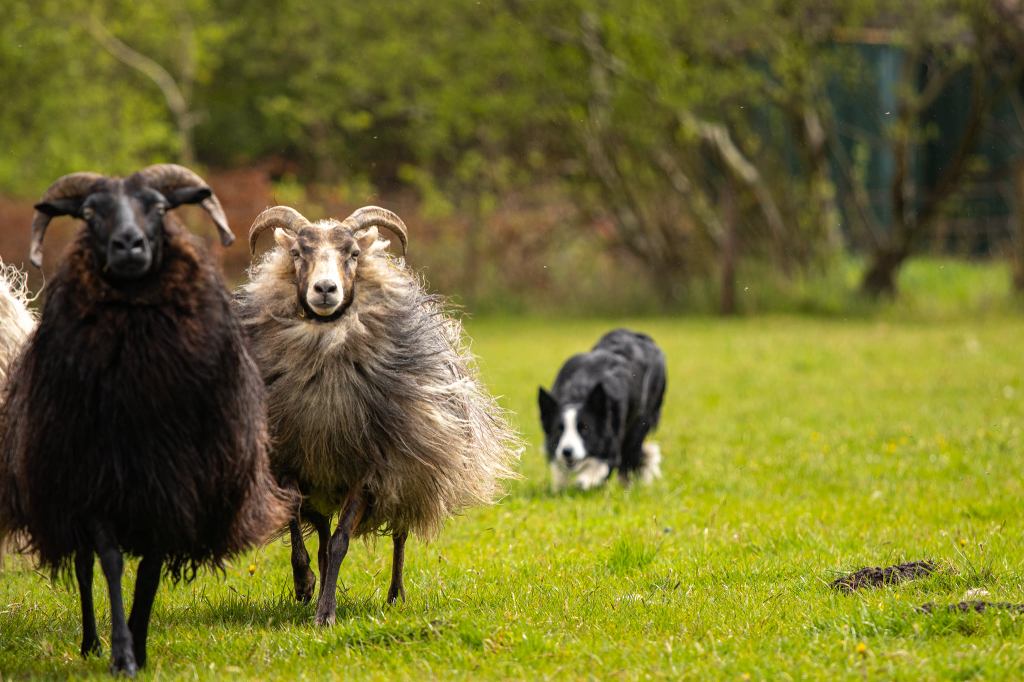 Finlay in zijn element, bij de schapen. Vrijwel iedere Border Collie is begonnen met een training bij een kleine groep schapen. En nog regelmatig worden de puntjes op de i gezet. De driejarige Border Collies Finlay en Fleur moeten samen gaan werken. Nu is het nog “wie verzamelt de meeste schapen voor zichzelf”.