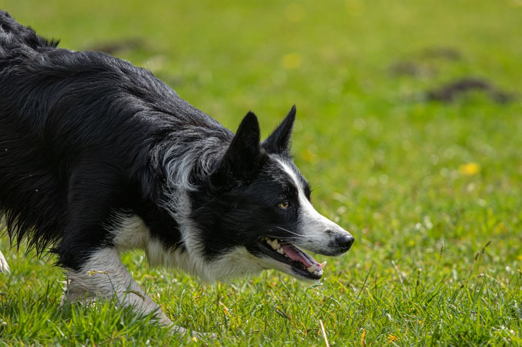 Finlay in de typische Border Collie houding. Hij heeft behoorlijk veel “eye” en de schapen hebben dan ook ontzag voor hem. Maar ook dat moet groeien. Afstand nemen, de juiste afstand per hond, de ene hond moet het hebben van zijn beweeglijkheid, de ander juist van die dwingende ogen “eye”.