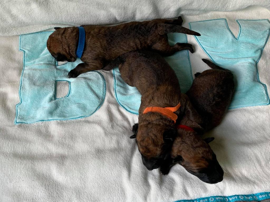 Zeven stuks, drie reutjes en vier teefjes. Het zijn grote stevige puppen, ze wegen rond de 500 gram. De halsbandjes heb ik vanmorgen al voor de tweede keer groter moeten maken.