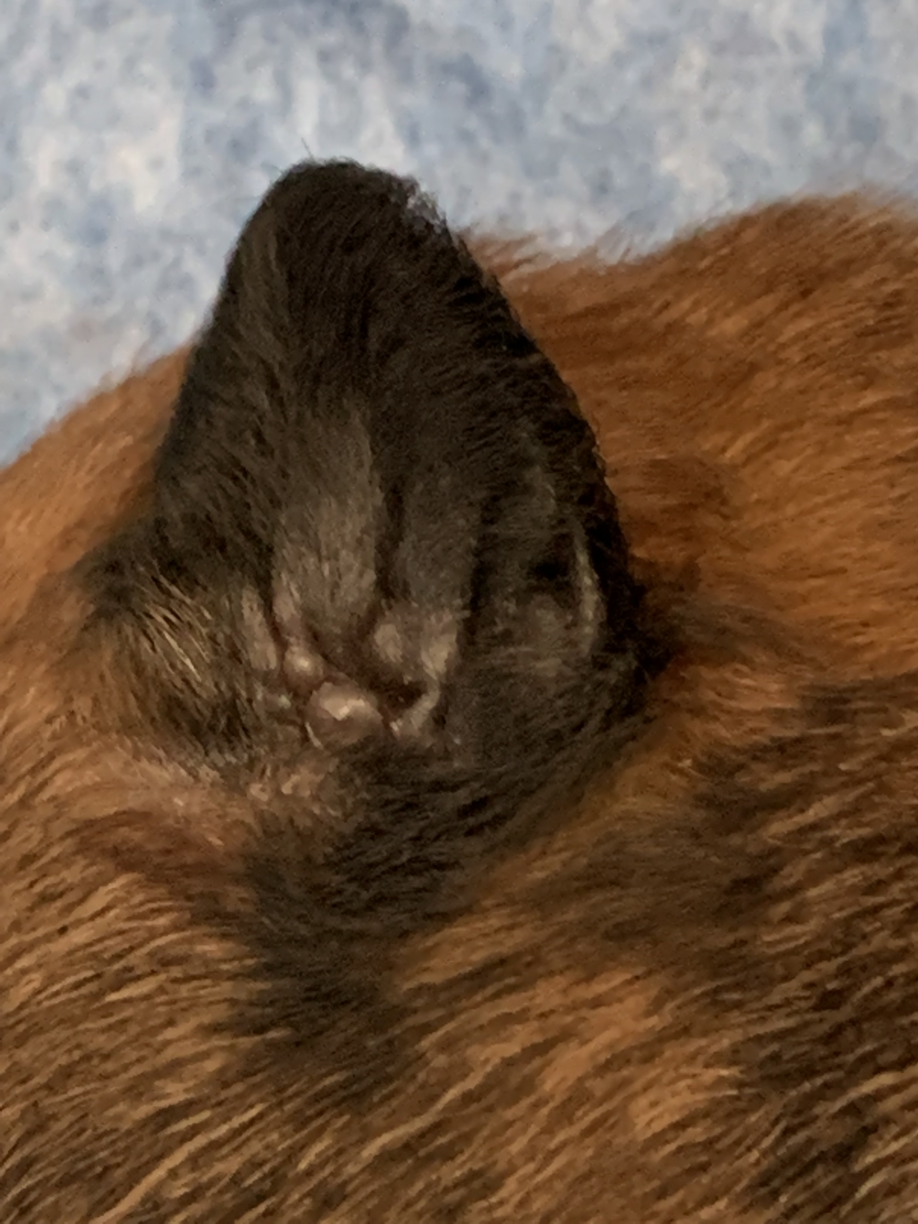 De oortjes zijn nog dicht, normaal voor deze leeftijd maar niet eerder heb ik daarvan een foto gemaakt. Ze zitten echt nog dicht. Rond de tien dagen gaan de oren en ogen open, al zien ze dan nog niet veel. Rond deze tijd zijn ze ook in staat om hun lichaamstemperatuur op peil te houden. Dat betekent dat de warmtelamp, die in een hoek van de kist hangt, ’s nachts uit mag.