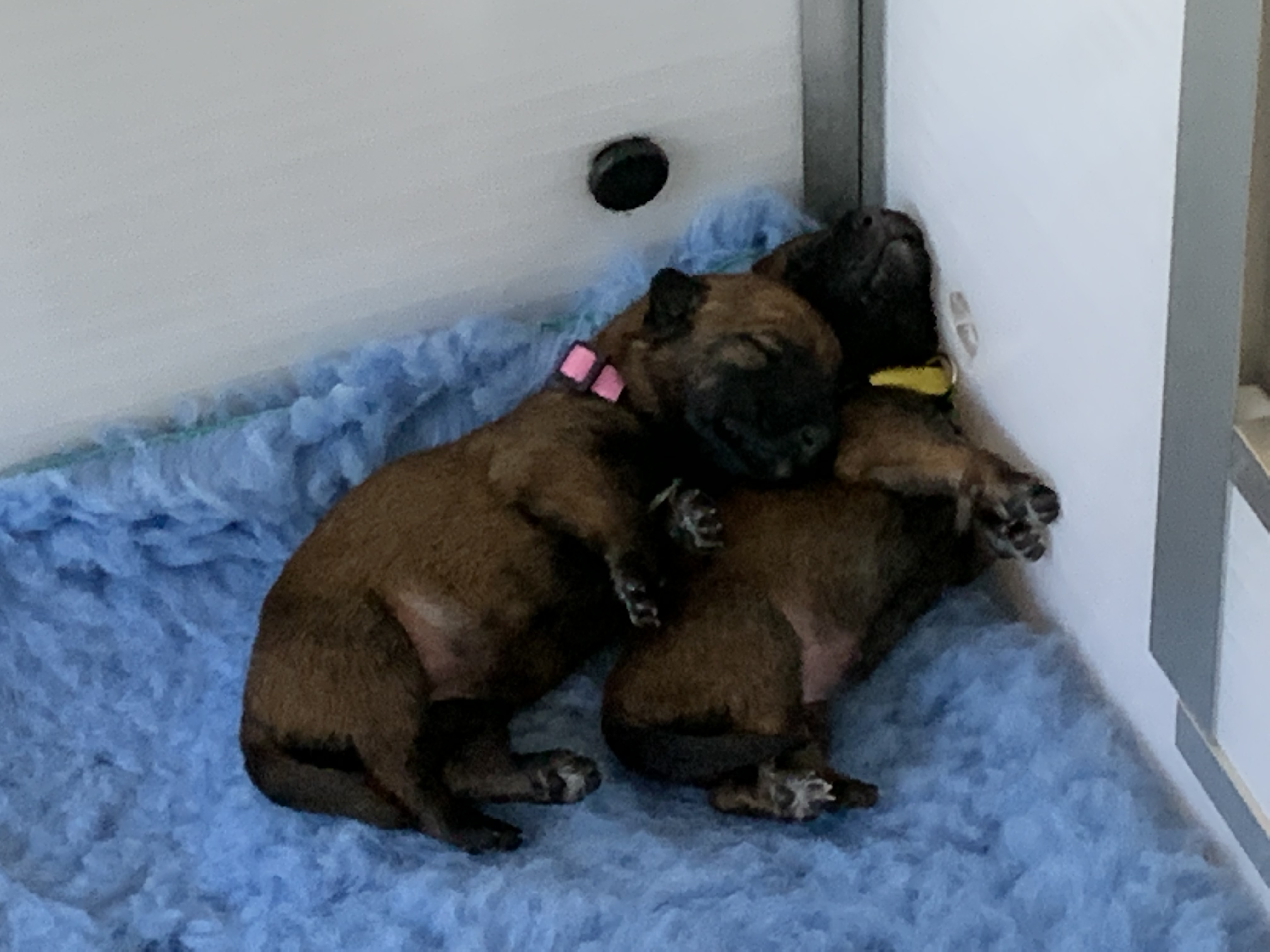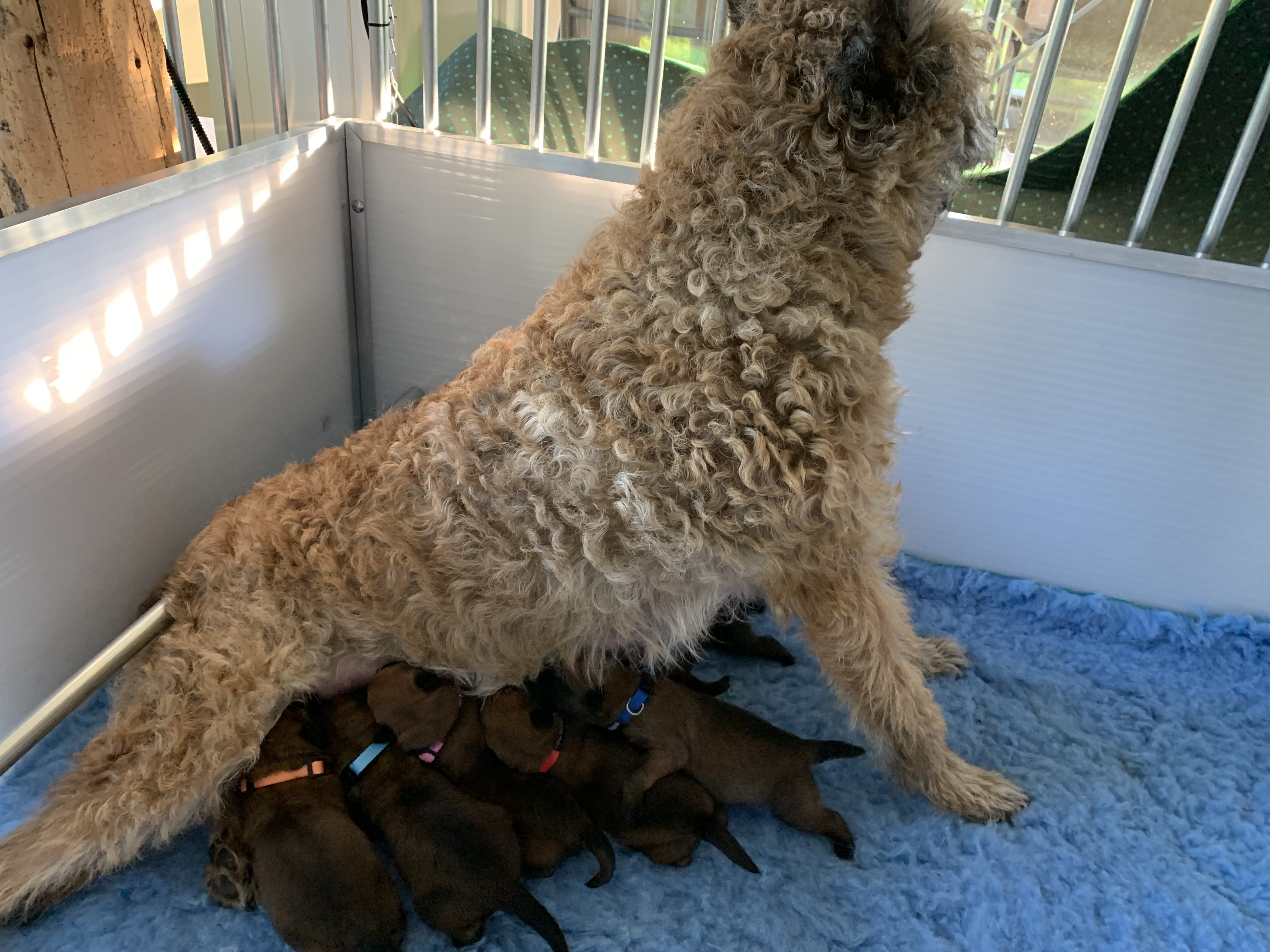 Exact een week oud, zijn ze vandaag. En ze doen het fantastisch Ze groeien als kool, redden zich al goed in de werpkist en houden Sterre aardig bezig. Net als de vorige keer is Sterre een uitstekende moeder. Ze heeft vannacht voor het eerst naast de werpkist geslapen. Er pal naast, dat wel.