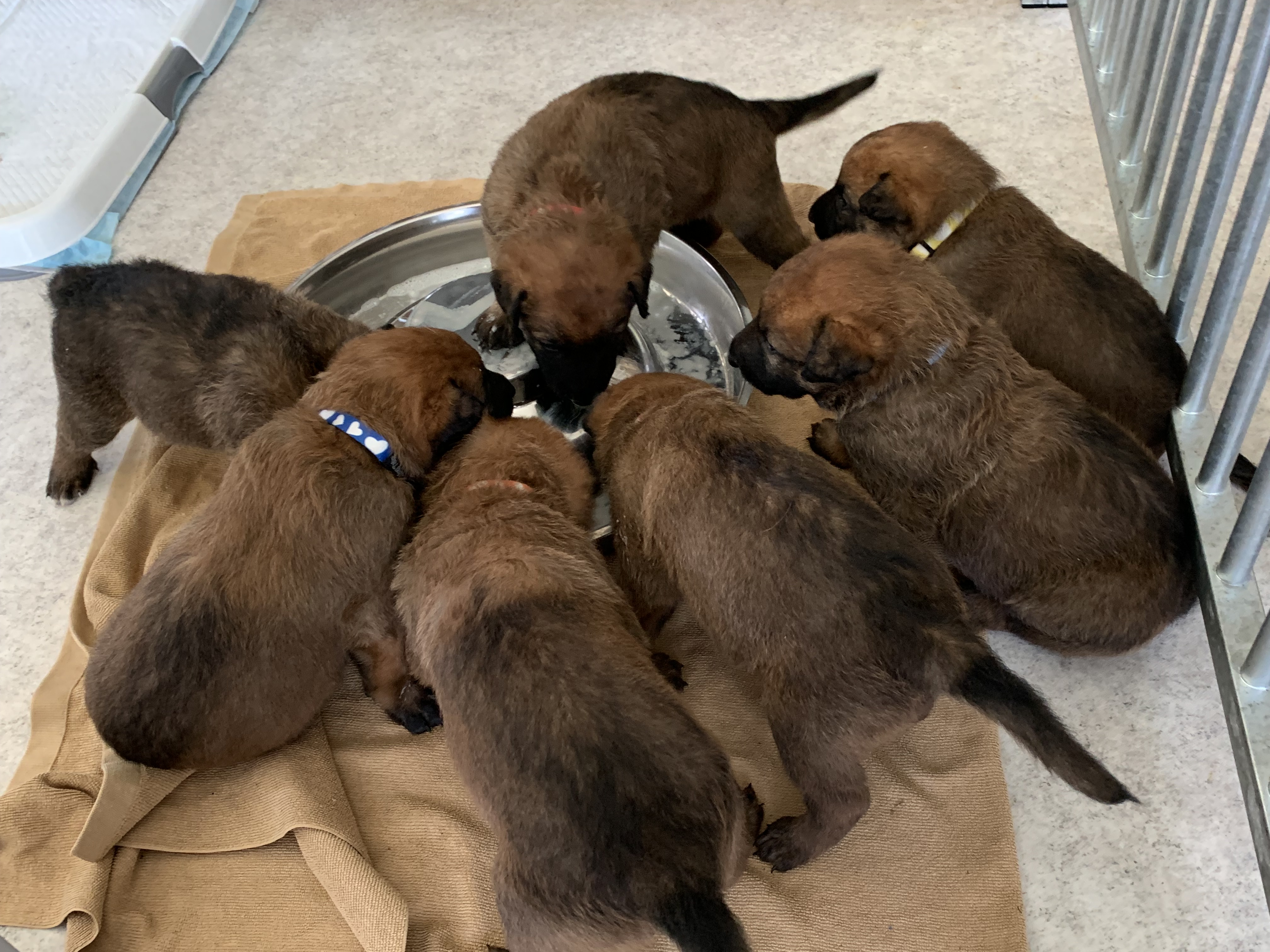 Van kleine humpiedumpies naar echte hondjes. De laatste week groeien ze hard. Kwispelen, grommeltjes en blafjes, en een race naar de etensbak.