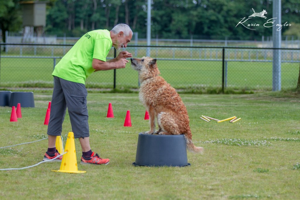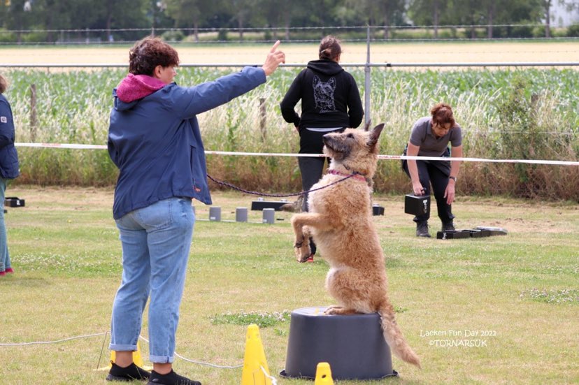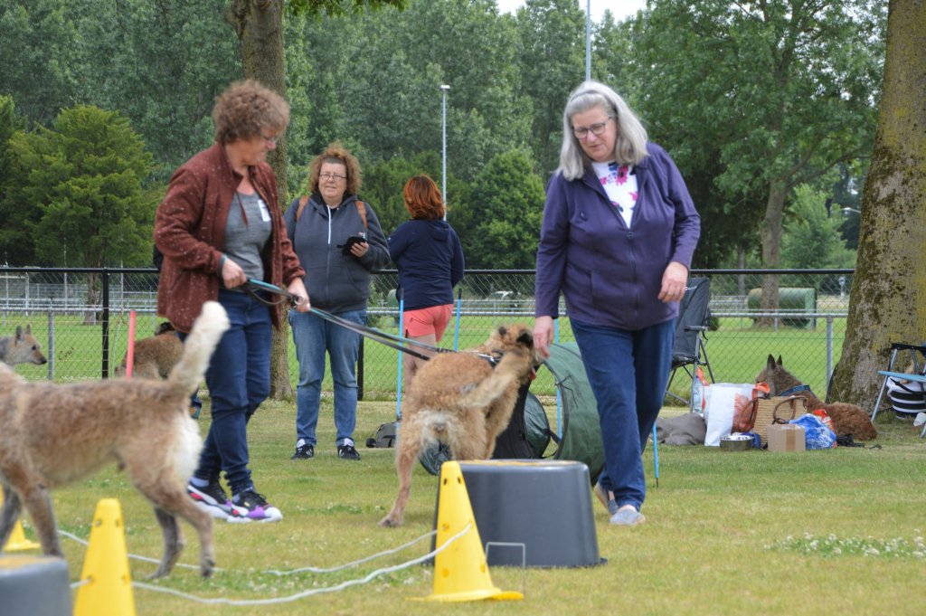 Een ochtendprogramma zouden we doen en dan de middag besteden aan ronddwalen en lekker bijkletsen. Door de aanhoudende stroom honden die graag de cirkel eens wilden uitproberen, kwamen we om 16.00 uur tot de conclusie dat het een volle dag was geworden. Zelfs tijdens het afbreken zaten er nog honden op de ton en namen een deel van het parcours mee.